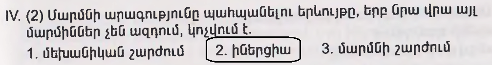 Ստացված առաջին փորձից ես հասկացա, որ միայնակ մարմինը ինքնիրեն չշարժվեց, երկրորդ փորձից հասկացա, որ եթե մի երրորդ փորձից հասկացա որ այդ ազդեցությունները նույնն են։ Այս երևույթին ֆիզիկայում անվանում են փոխազդեցություն։ Ես հասկացա, որ փոխազդման ժամանակ մարմինները իրար վրա ազդում են նույն ուժով։ Այ մրմինը, որը փոխազդեցությքան ժամանակ ավելի քիչ է արագությունը փոխում ասում ենք, որ նա իներտ է։