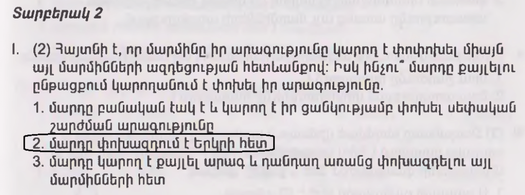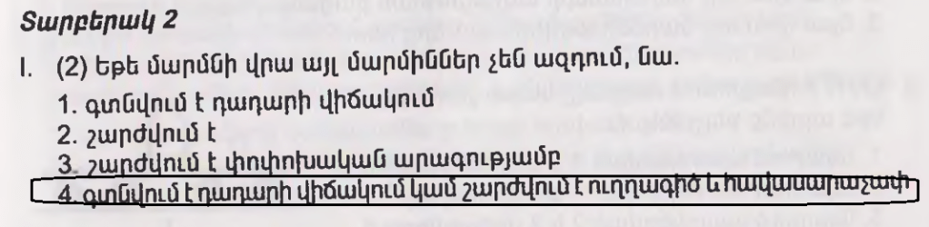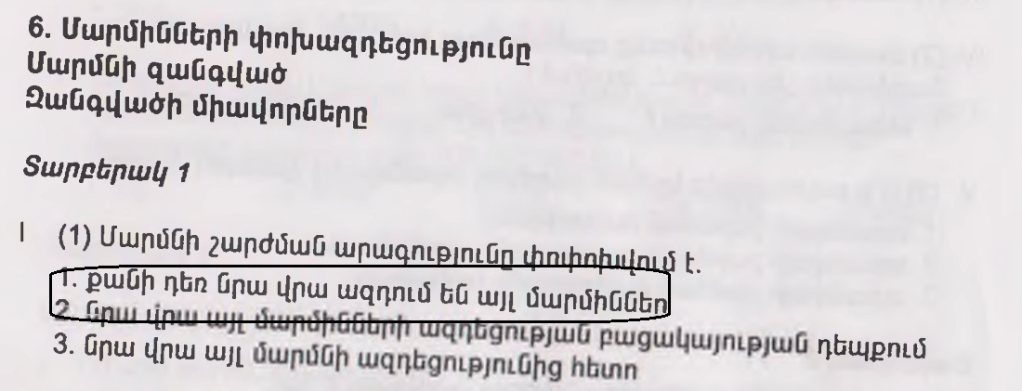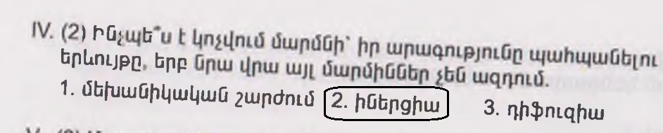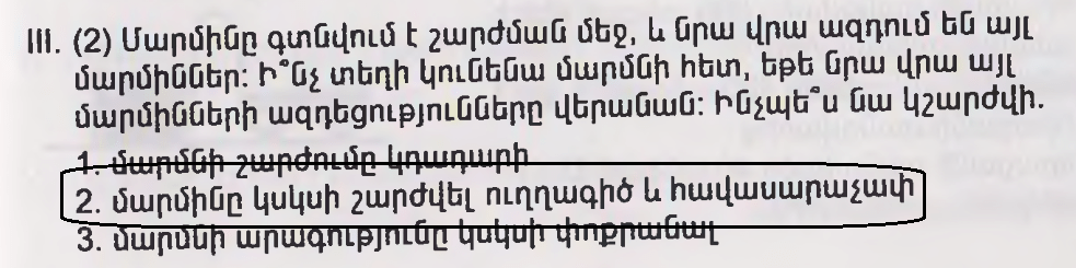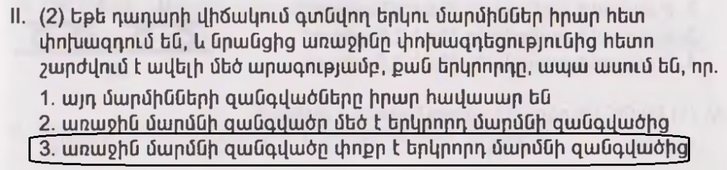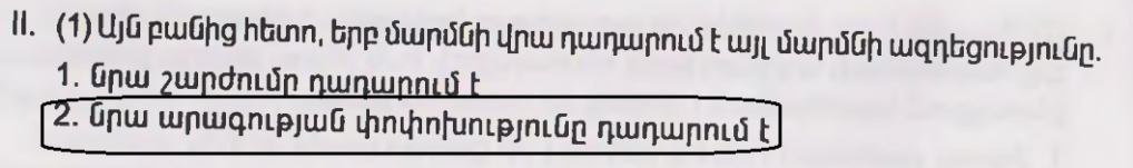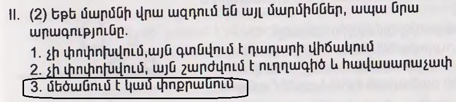 Եզրակացություն՝ առաջին փորձից ելնելով հասկացանք, որ միայնակ մարմինը չի շարժվում, իսկ երկրորդ փորձից հասկացանք, որ երբ մի մարմինը ազդում է ուրիշ մարմնի վրա, այն շարժվում է։