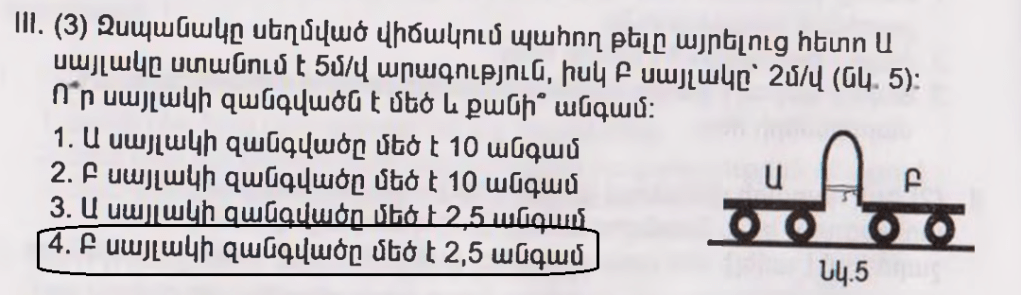ՓՈՐՁ ԵՐՐՈՐԴ․ Վերցնում ենք նորից այն սայլակը, որին ամրացված էր առաձգական մետաղյա թիթեղ։ Ճկեցի թիթեղը, կապեցի թելով։ Այն դրեցի հատակին, հատակի նկատմամբ այն գտնվում է դադարի վիճակում։ Մոտեցրեցի ուրիշ սայլակ և այրեցի թելը։ Այրելուց հետո առաձգական թիթեղը ուղղվելով հարվածեց մյուս սայլակին և նրանք համարյա հավասար չափով իրարից հեռացան՝ փոխազդեցին։
