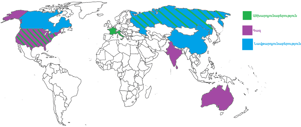 1. Քարտեզի վրա նշել նավթ, գազ և ածուխ արդյունահանող առաջատար երկրները: