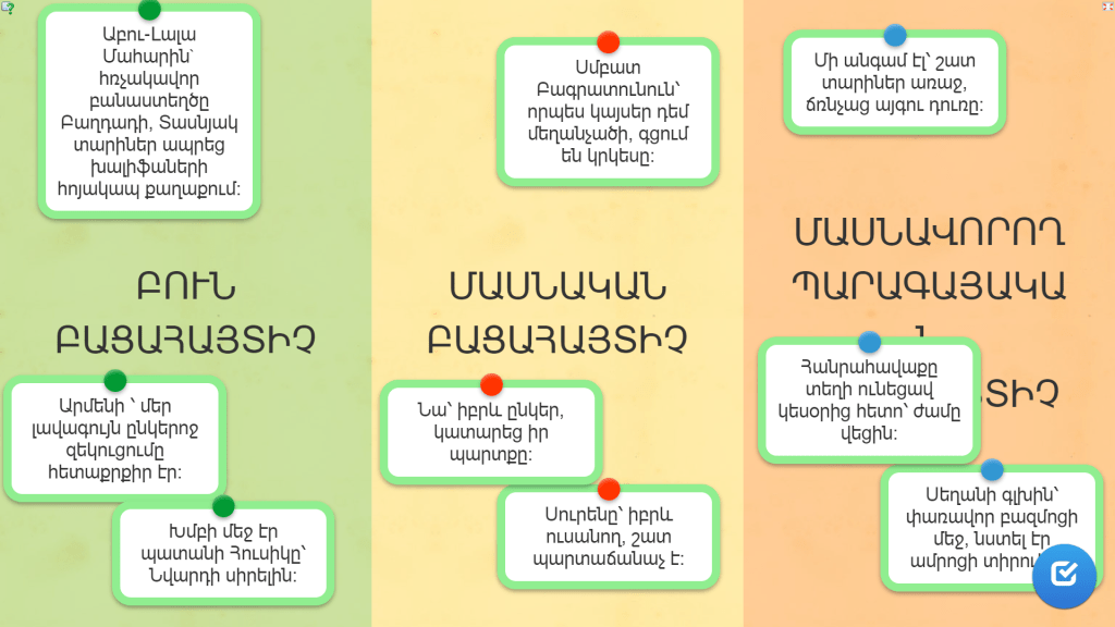 Հայոց լեզու Դասարանական աշխատանք 01.04.2022 Posted on 01.04.2022 by Նանե Տեսակավորման փոքրիկ խաղով վերհիշենք բացահայտչի տեսակները: Поделиться ссылкой: Click to share on X (Opens in new window) X Click to share on Facebook (Opens in new window) Facebook Like Loading... Related