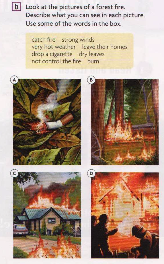 In this pictures I can see cigarette that isn’t extinguished and is burning. It was dropped on dry leaves so leaves can catch fire and burn. Than the fire from leaves was spread by strong wind and the trees burned too. Also as we see the weather is very hot which can help fire to get stronger. The fire burned that houses near that forest so people who lived there had to leave their homes. They called firefighters who helped put out the fire.
