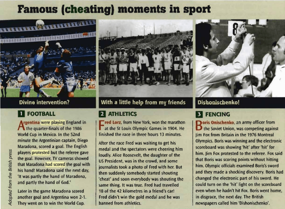NEF Student’s Book. slide 9 Read the texts about cheating moments in sport choose one and be ready to present in class.