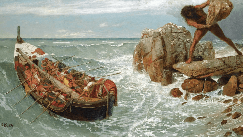 Ոդիսևսի ճանապարհորդությունը դեպի տուն կտևի տասը տարի և կներառի բազմաթիվ արկածներ: Դրանք ներառում են Պոլիֆեմոսի՝ ցիկլոպների (միաչք հսկա) հետ մարտում ներգրավվելը, Կալիպսոյի նիմֆայի կողմից կղզում գերի մնալը և կորցնելով իր նավը ծովի զայրացած աստված Պոսեյդոնի կողմից ուղարկված փոթորկի մեջ: Երբ նա վերջապես հասնում է տուն, տեսնում է, որ իր դժվարությունները չեն ավարտվել: Ոդիսևսի երկար բացակայության պատճառով ենթադրվում է, որ նա մահացել է, և մի խումբ հայցորդներ գրավել են նրա պալատը և մրցում են իր կնոջ՝ Պենելոպեի ձեռքի համար: