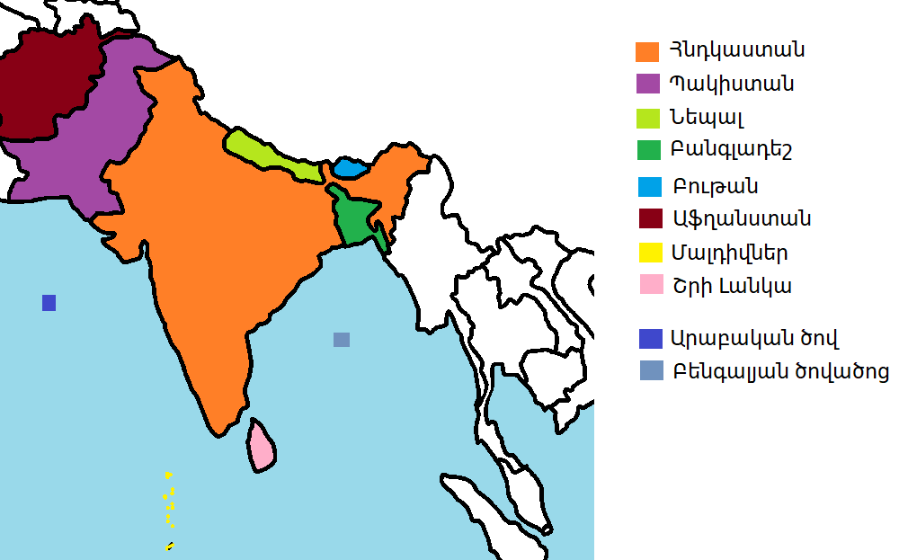 4. Քարտեզի վրա նշել Հարավային Ասիայի երկրները և այդ երկրների ափերը ողողող ջրային ավազանները:
