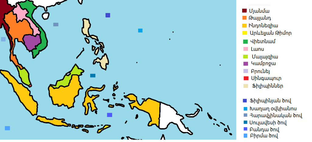 1. Քարտեզի վրա նշել Հարավարևելյան Ասիայի երկրները ու դրնաց ափերը ողողող ջրային ավազանները: