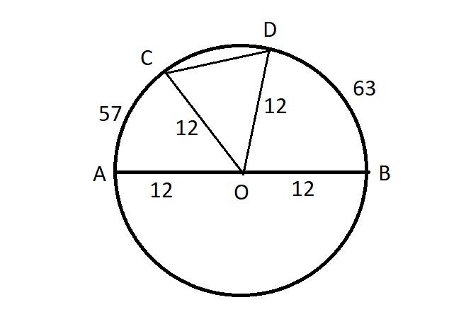<COD = 180 — (AC + BD) = 180 — (57 + 63) = 60o