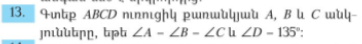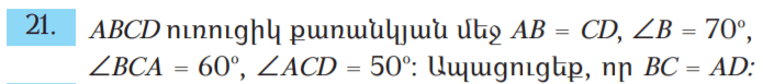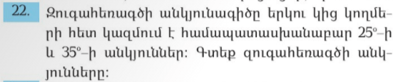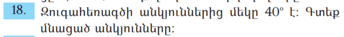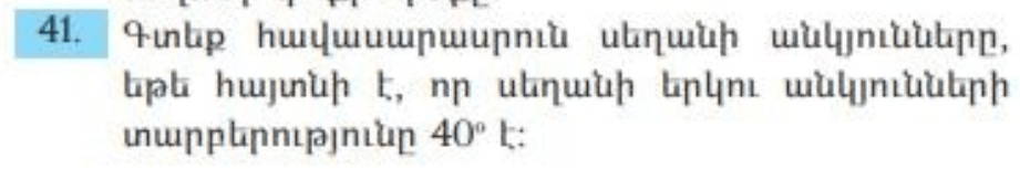 5․Ուղղանկյան անկյունագծերի կազմած անկյունը 80° է: Որքա՞ն են անկյունագծի կազմած անկյունները ուղղանկյան կողմերի հետ: