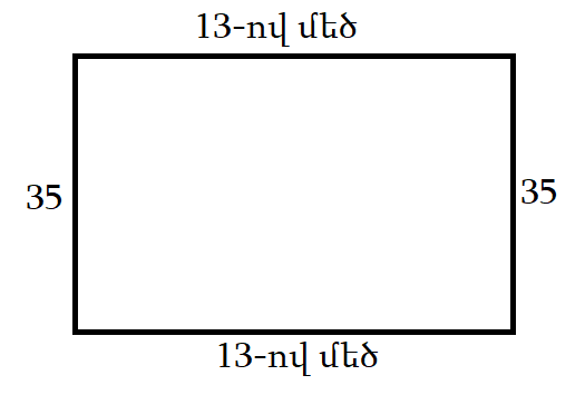 1․Ուղղանկյան մի կողմը 35 սմ է, իսկ մյուս կողմը 13 սմ-ով մեծ է: Հաշվիր ուղղանկյան պարագիծը: