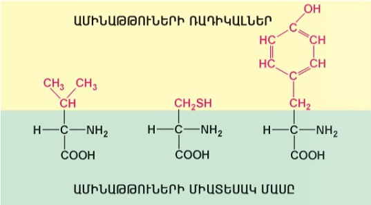 Ամինաթթուները միանցից տարբերվում են ռադիկալներով, իսկ կարբօքսիլային խումբը և ամինախումբը բոլորի մոտ նույնն է: Սպիտակուցի 1գ ճեղքումից առաջանում է 17,6կՋ էներգիա: Սպիտակուցի ֆունկցիաներն են՝ կառուցողական, կատալիզային, շարժողական, փոխադրական, պաշտպանական, ազդանշանային, էներգիական և կարգավորիչ: