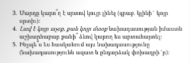 5. Առաջարկը միաձայն ընդունվեց, և հաջորդ օրվանից բոլորը սկսեցին աշխատանքի գալ մեկ ժամ շուտ, որպեսզի կարողանան ժամանակին ավարտել պատվերի կատարումը։ (սկսել, ընդունել, կարողանալ)
