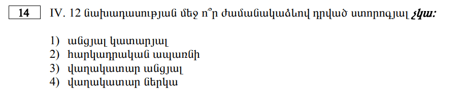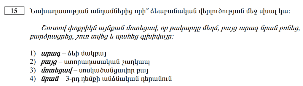 Շողաց — պարզ, սահմանական եղանակ, անցյալ կատարյալ, եզակի թիվ, երրորդ դեմք Հիշեցի — պարզ, սահմանական եղանակ, անցյալ կատարյալ, եղակի թիվ, առաջին դեմք Խշշաց — պարզ, սահմանական եղանակ, անցյալ կատարյալ, եզակի թիվ, երրորդ դեմք Դողաց — պարզ, սահմանական եղանակ, անցյալ կատարյալ, եզակի թիվ, երրորդ դեմք Փախավ — ածանցավոր, սահմանական եղանակ, անցյալ կատարյալ, եզակի թիվ, երրորդ դեմք Ծածկվեց — ածանցավոր, սահմանական եղանակ, անցյալ կատարյալ, եզակի թիվ, երրորդ դեմք